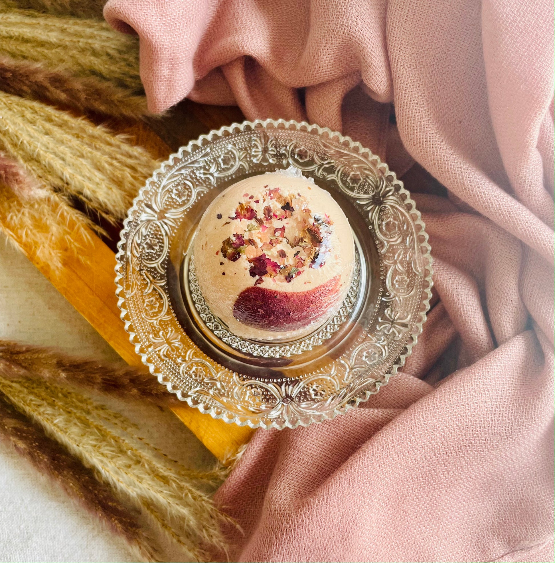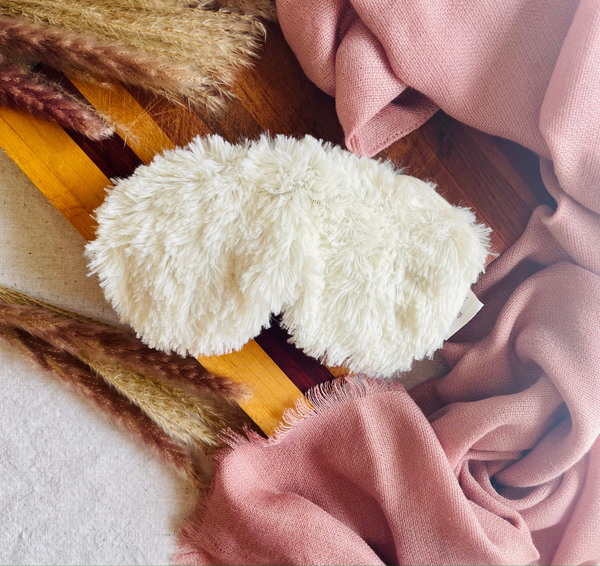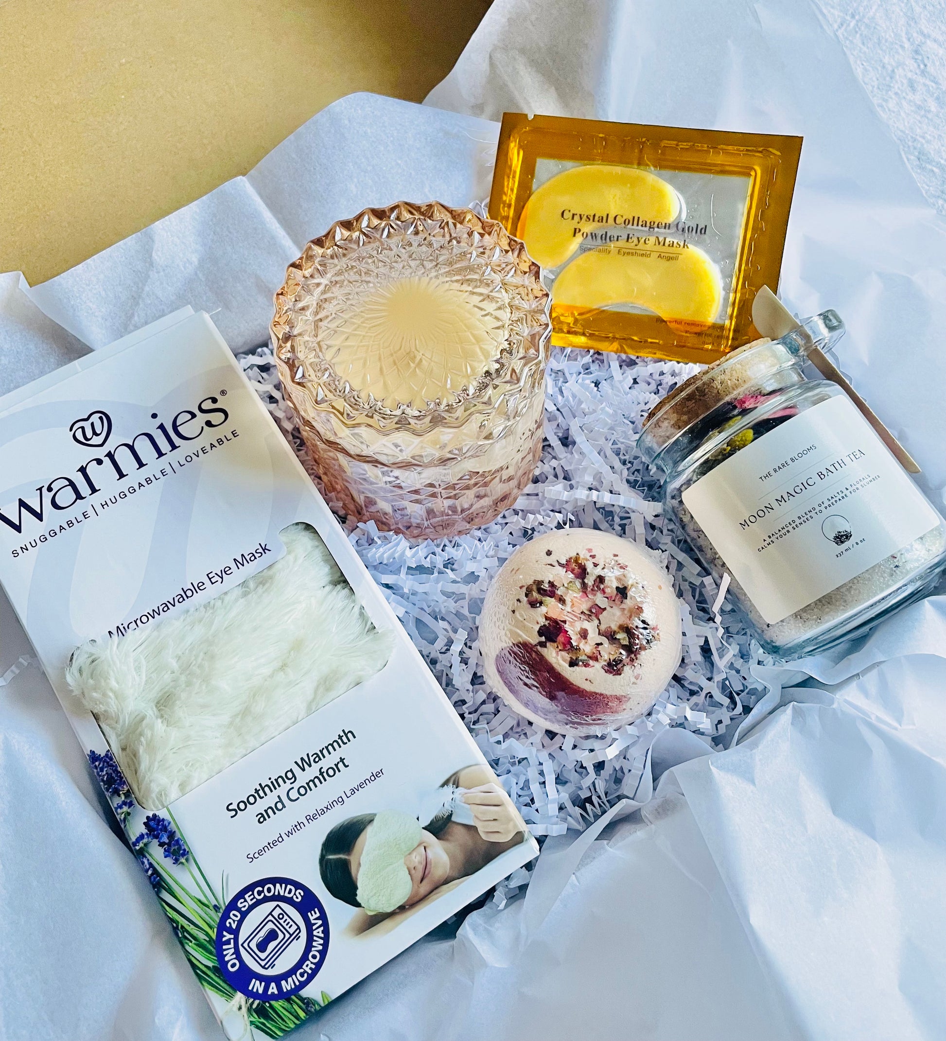 Warmies Plush Eye Mask, Alluring Amber Shimmer candle, Grapefruit Rose Bath Bomb, Moon Magic Bath Tea, Crystal Collagen eye mask, white crinkle paper, white tissue, white gift box, double sided frayed satin ribbon, a scripted 'Enjoy' tag and seasonal floral!