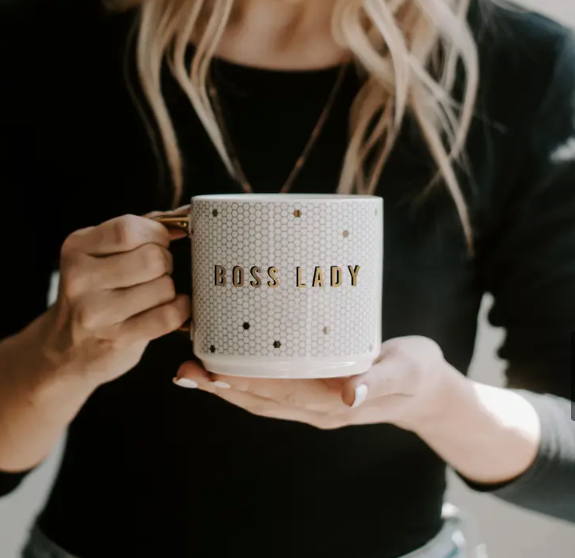 Original Design: Boss Lady • Design on Both Sides of Mug • White and Honeycomb Design with Real Gold Handle Embellishment and Lettering • Designed in the USA, Imported •