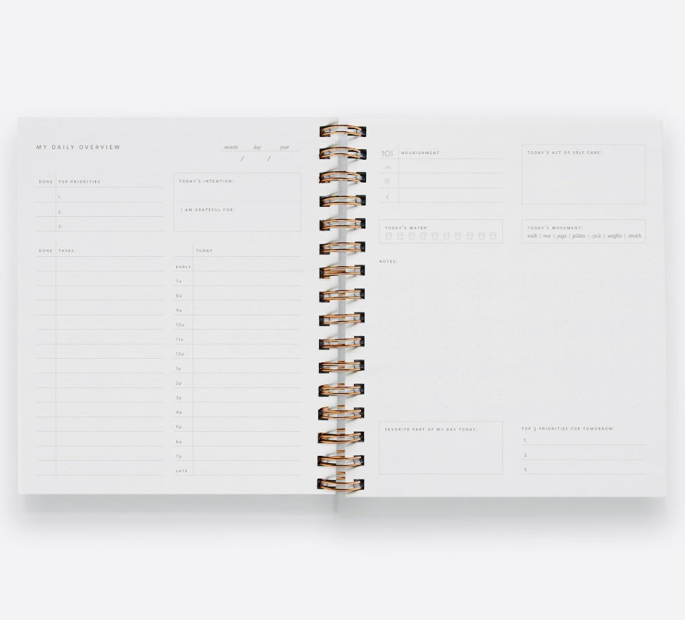 A daily planner to encourage days lived with intention and beauty. Includes 100 days of planning so you can live your most intentional life. Our Daily Overview Planner has an extra thick cover complete with gold foil details. Space for lists, gratitude, and self care make up the inner pages printed on a soft white paper. Dateless pages so you can plan your days when its right for you.Â
