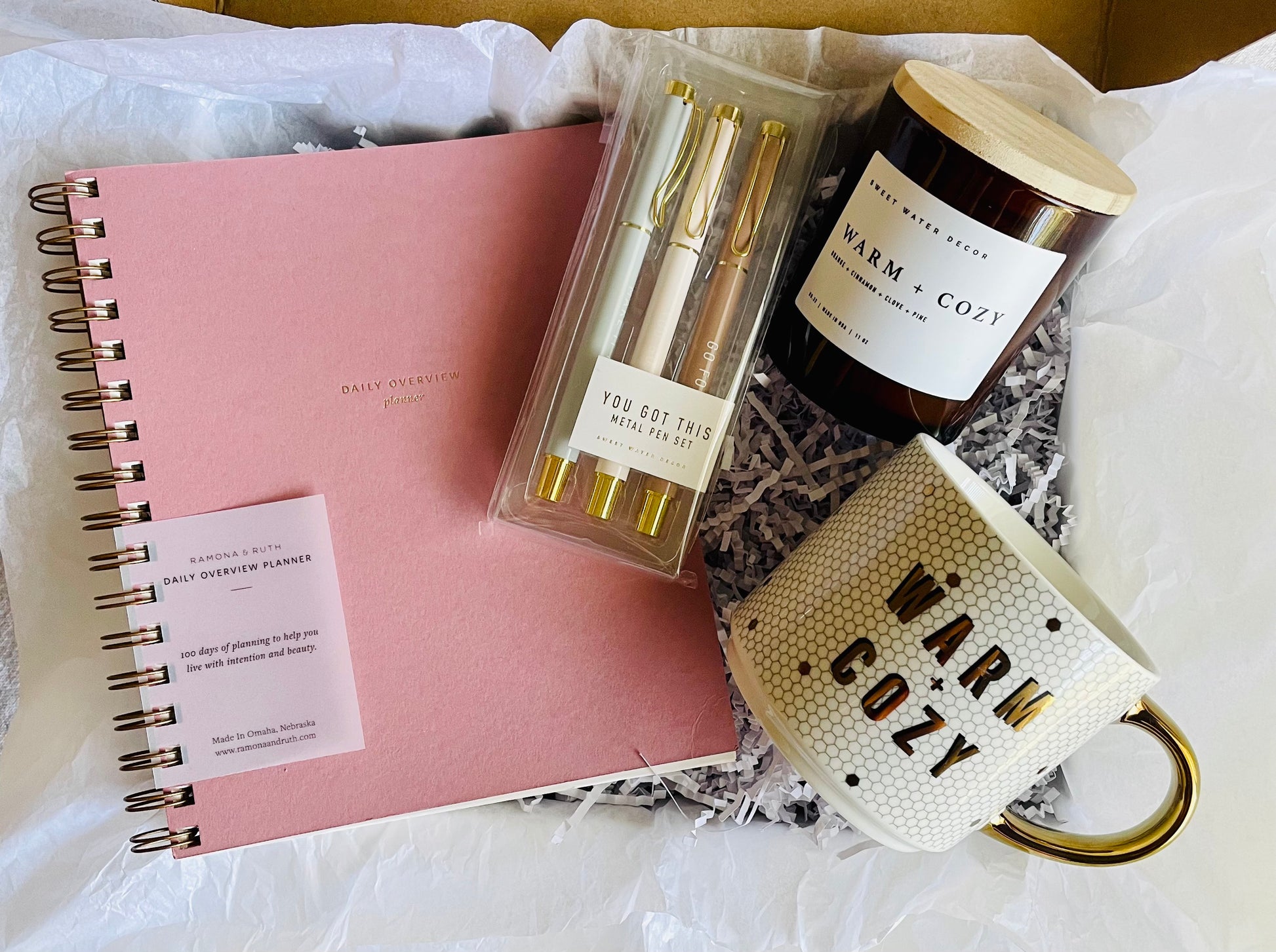 The Daily Overview Planner, You Got This Metal Pen Set, 11oz Warm + Cozy Candle, 17oz Warm + Cozy Coffee Mug, white gift box, white crinkle paper, satin ribbon with floral garnish and personalized gift tag.