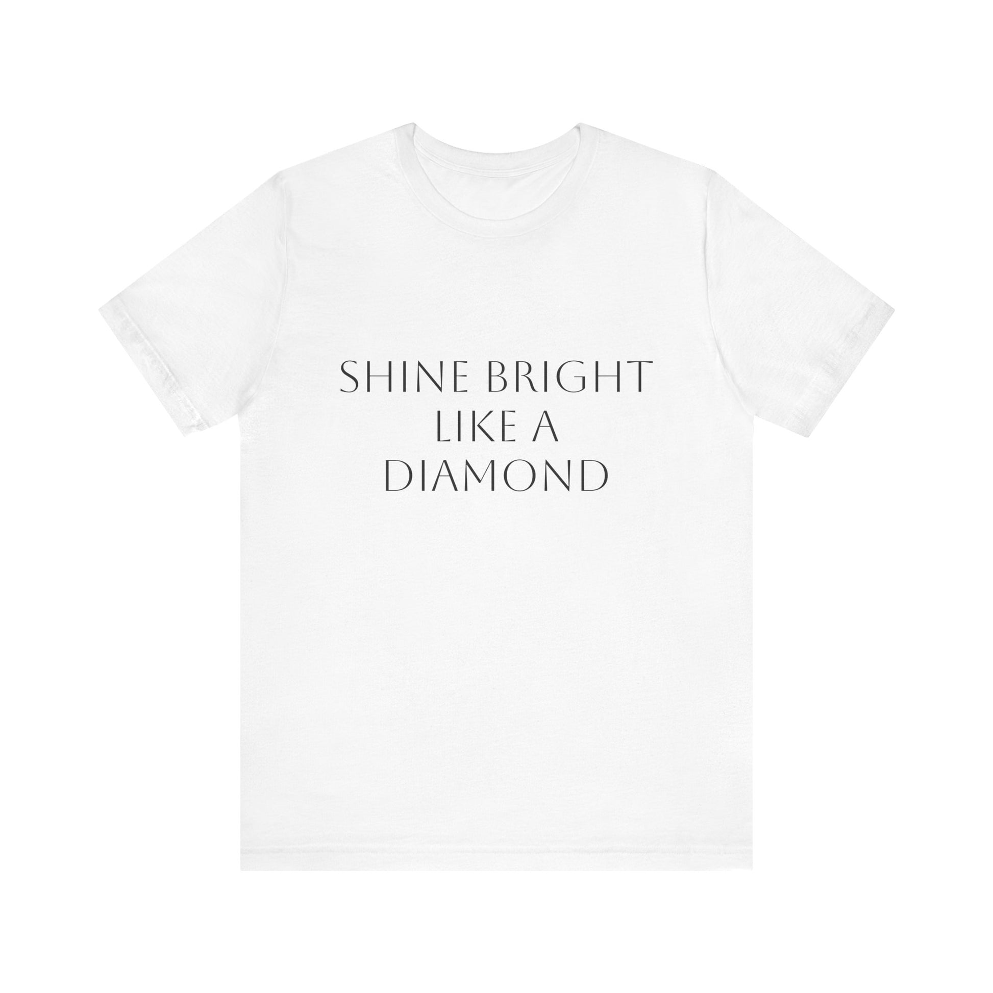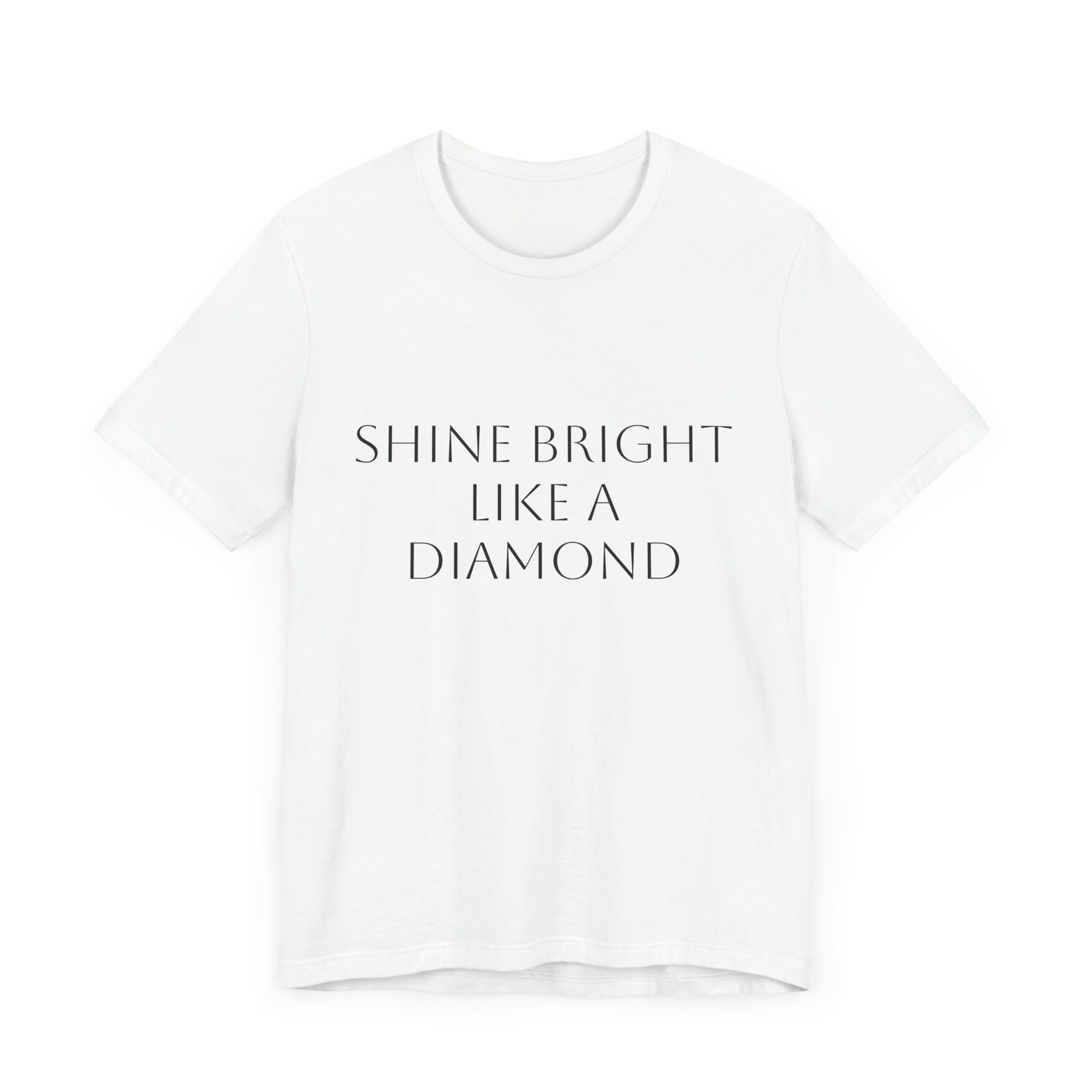 A Unisex Jersey Short Sleeve Tee with the quote 'Shine Bright like a Diamond' printed on it, giving off a positive and empowering vibe. Perfect for casual wear and those looking to make a statement with their outfit. Ideal for anyone who loves motivational quotes and wants to add a touch of inspiration to their wardrobe. Relevant for occasions like birthdays, graduations, and everyday wear.