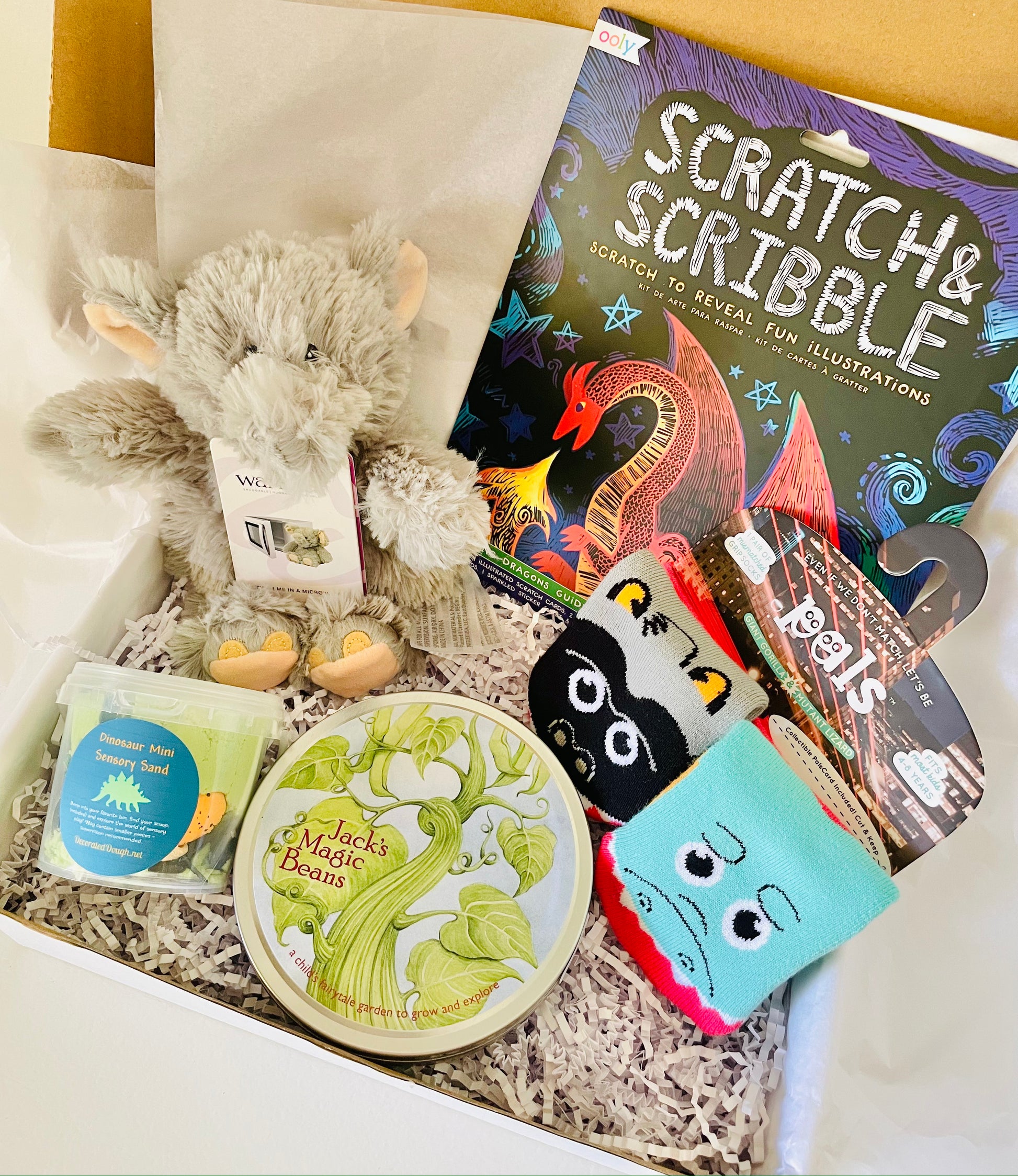 Let your child's imagination ROAR with this grand size giftbox filled with everything from dinosaur sensory sand, to an elephant warmie, and MORE! This box comes with SO many cute sensory items they can play with over and over. Teach your little one about the Jurassic Period, how to plant Jack's Magic Beans garden, and what it means to wear Pals socks all while allowing them to express their creativity!