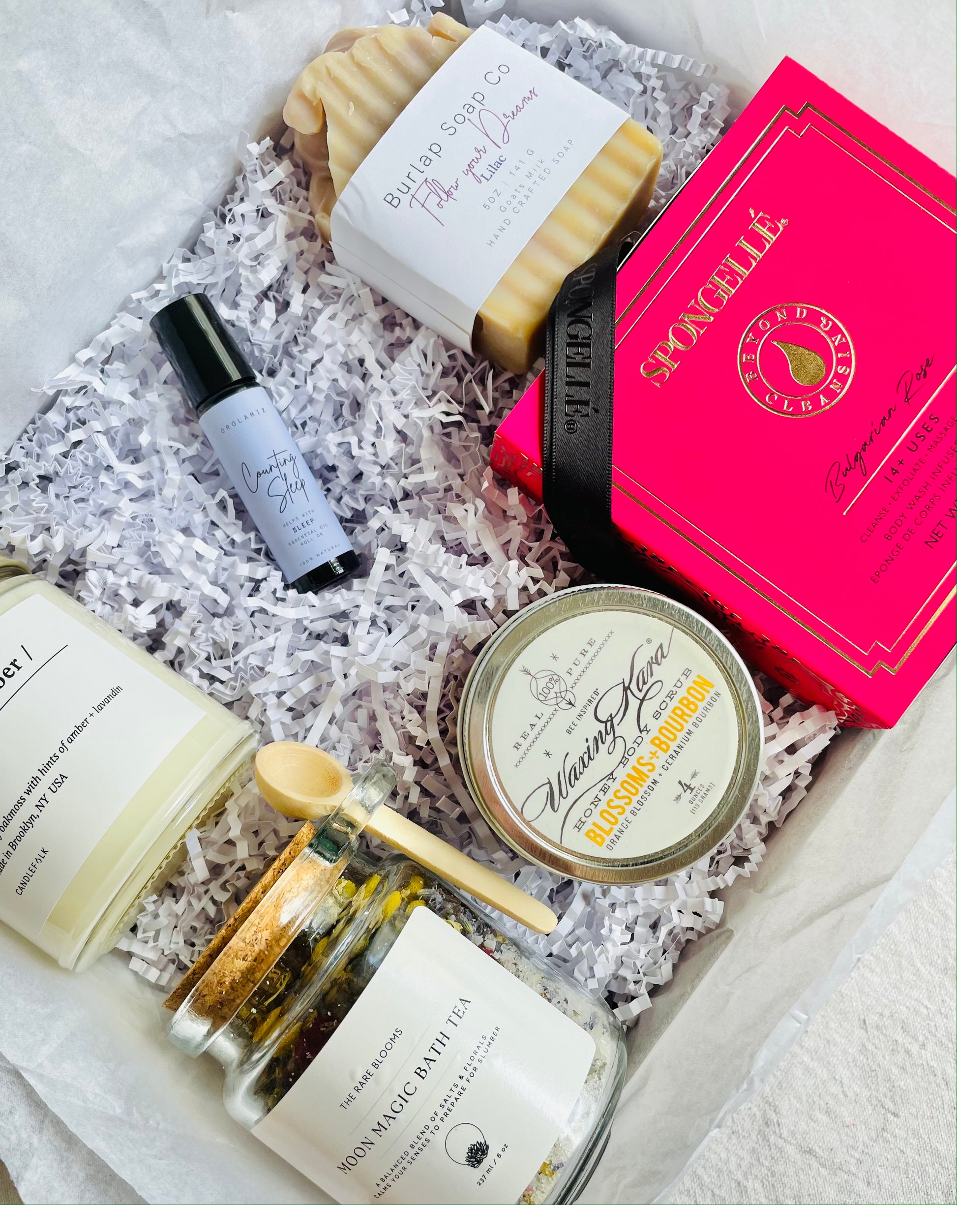 Oakmoss + Amber candle, Counting Sleep Roller, Follow Your Dreams soap, Moon Magic Bath Tea, Blossoms + Bourbon Honey Body Scrub, Bulgarian Rose Body Buffer, white crinkle paper, white tissue, white gift box, double sided frayed satin ribbon, a scripted 'Enjoy' tag and seasonal floral!