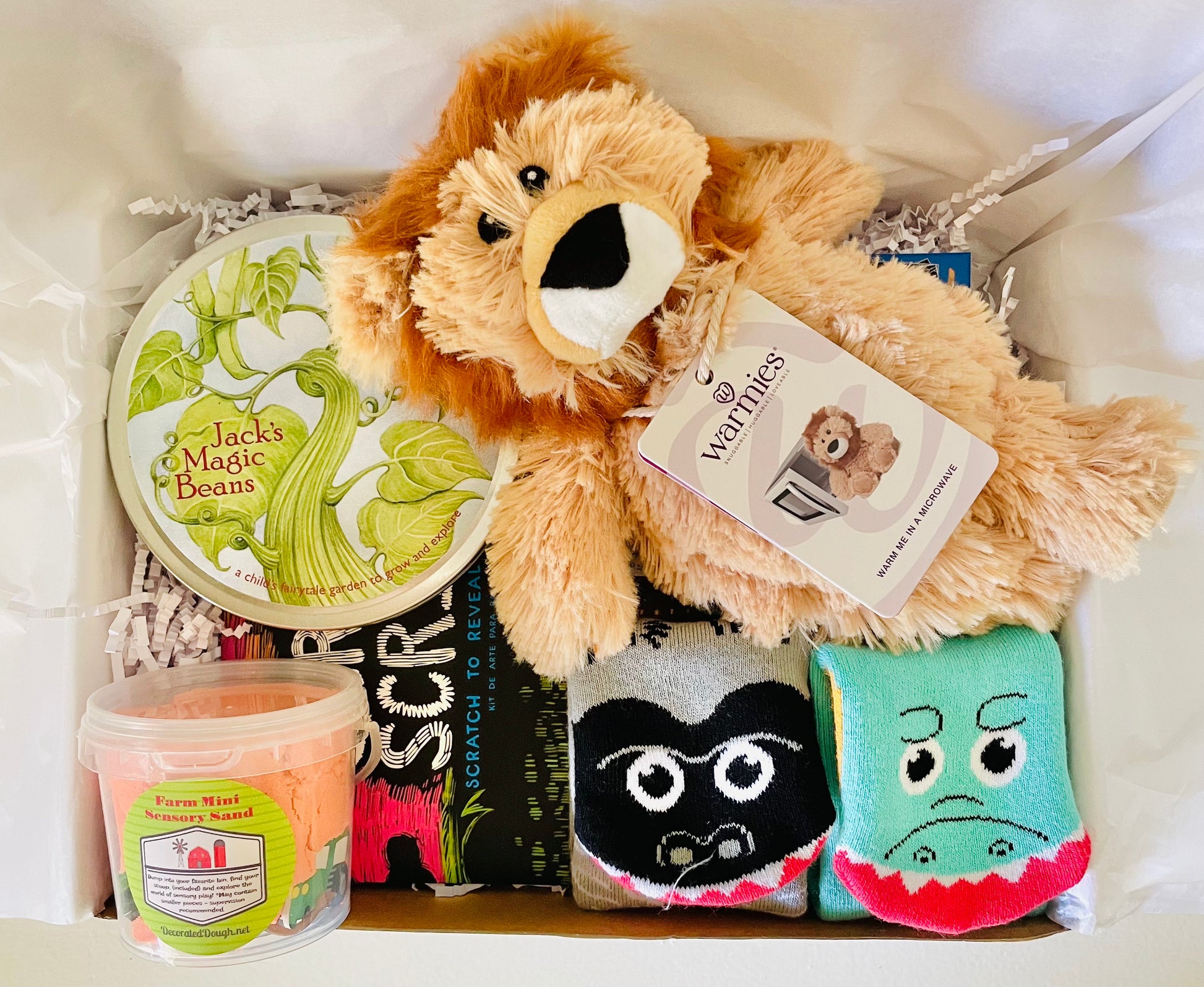 Let your child's imagination run WILD with this grand size giftbox filled with everything from farm sensory sand, to a lion warmie, and MORE! This box comes with SO many cute sensory items they can play with over and over. Teach your little one about farm life, how to plant Jack's magic beans, and what it means to wear Pals socks all while allowing them to express their creativity!