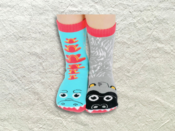 1 pair Pals Gorilla & Lizard mismatched socks - This giant monster duo comes adorably mismatched. Pals are stretchy and super soft tube socks with general size ranges. No-Skid grips for safety. All Pals don't match, because we don't have to match to be besties. Join us in creating a friendlier world! 89% cotton, 9% polyester, 2% spandex.