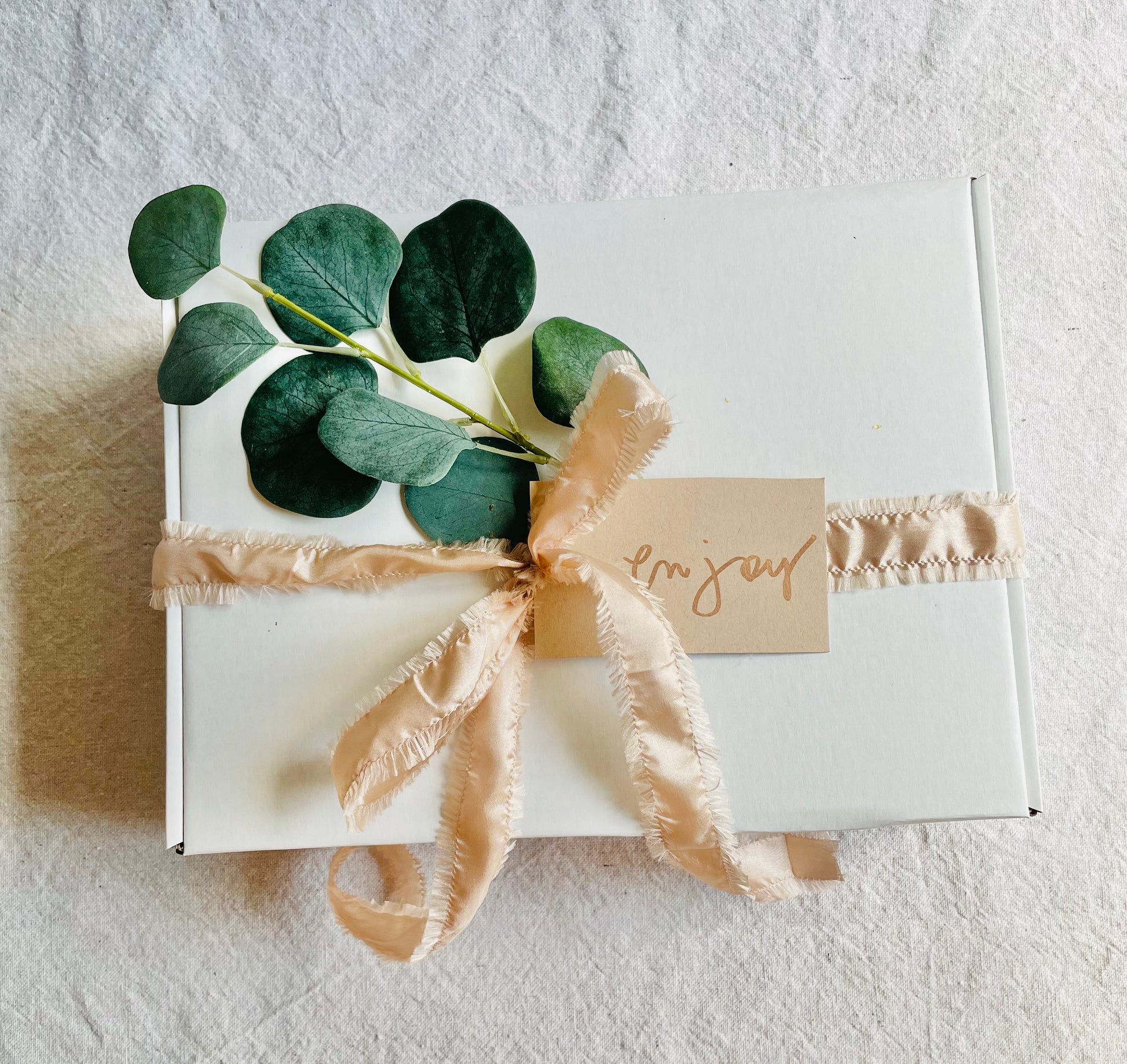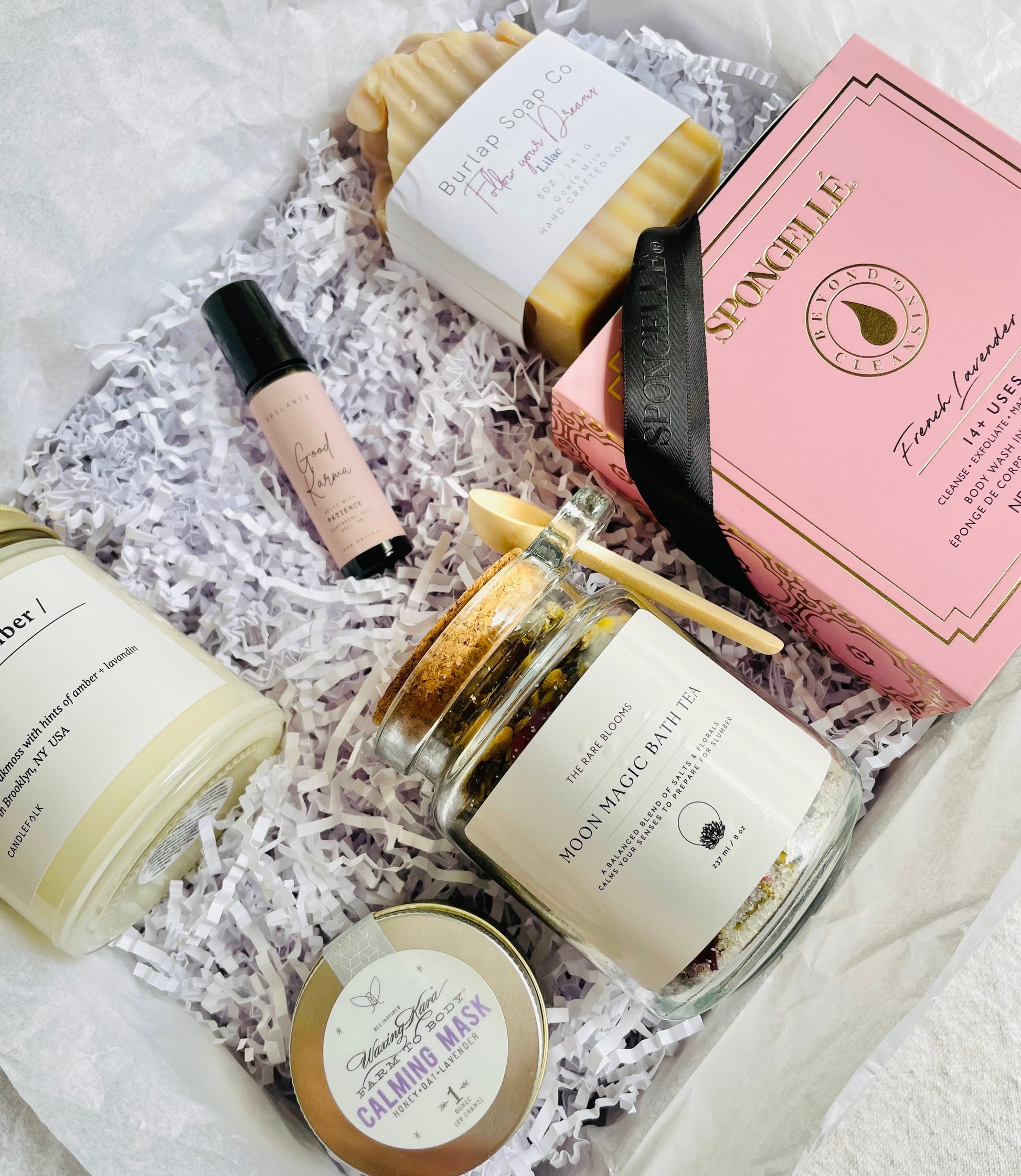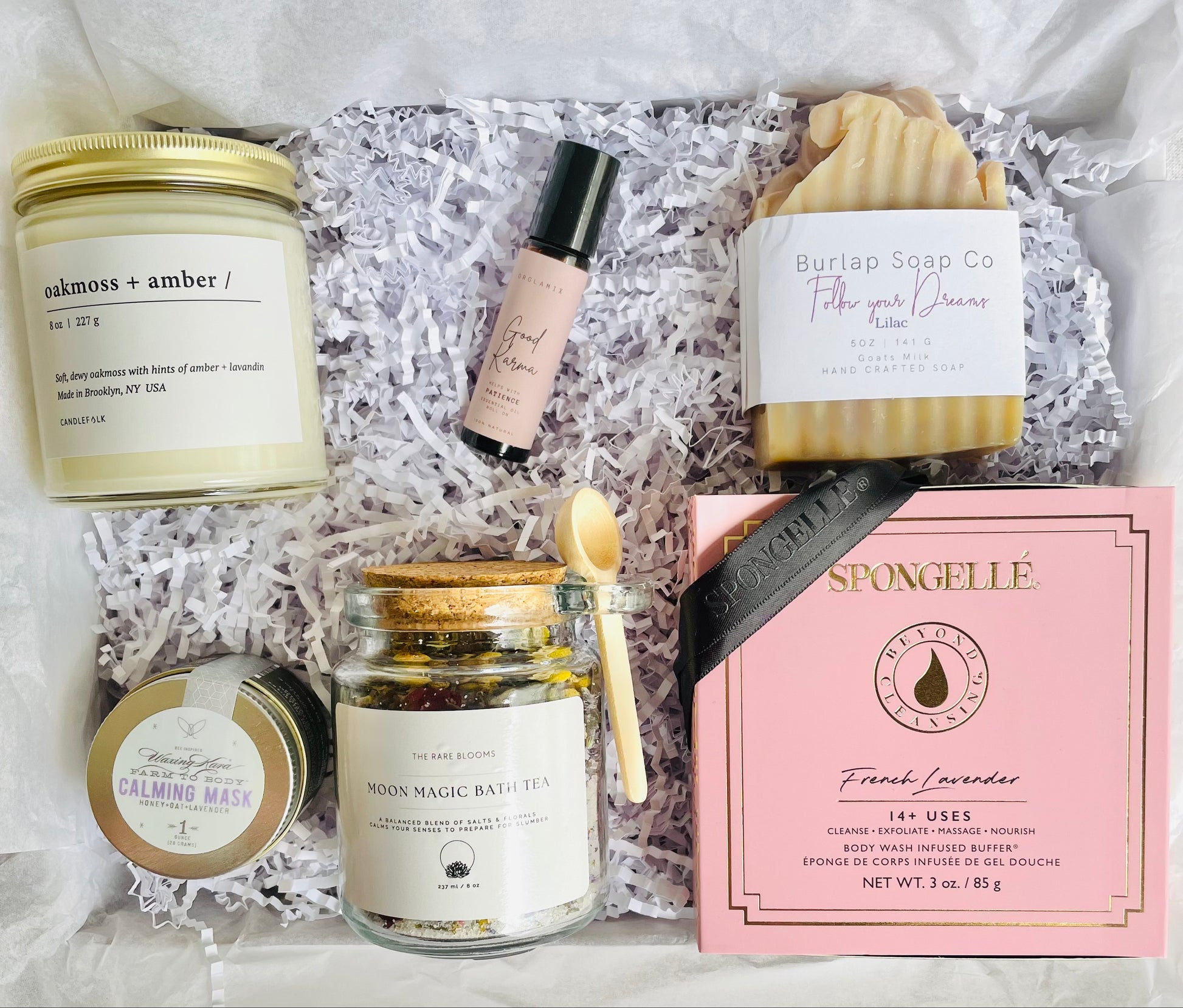Oakmoss + Amber candle, Good Karma roller, Follow your Dreams soap, Lavender Calming Mask, Moon Magic Bath Tea, French Lavender Body Buffer, white crinkle paper, white tissue, white gift box, double sided frayed satin ribbon, a scripted 'Enjoy' tag and seasonal floral!
