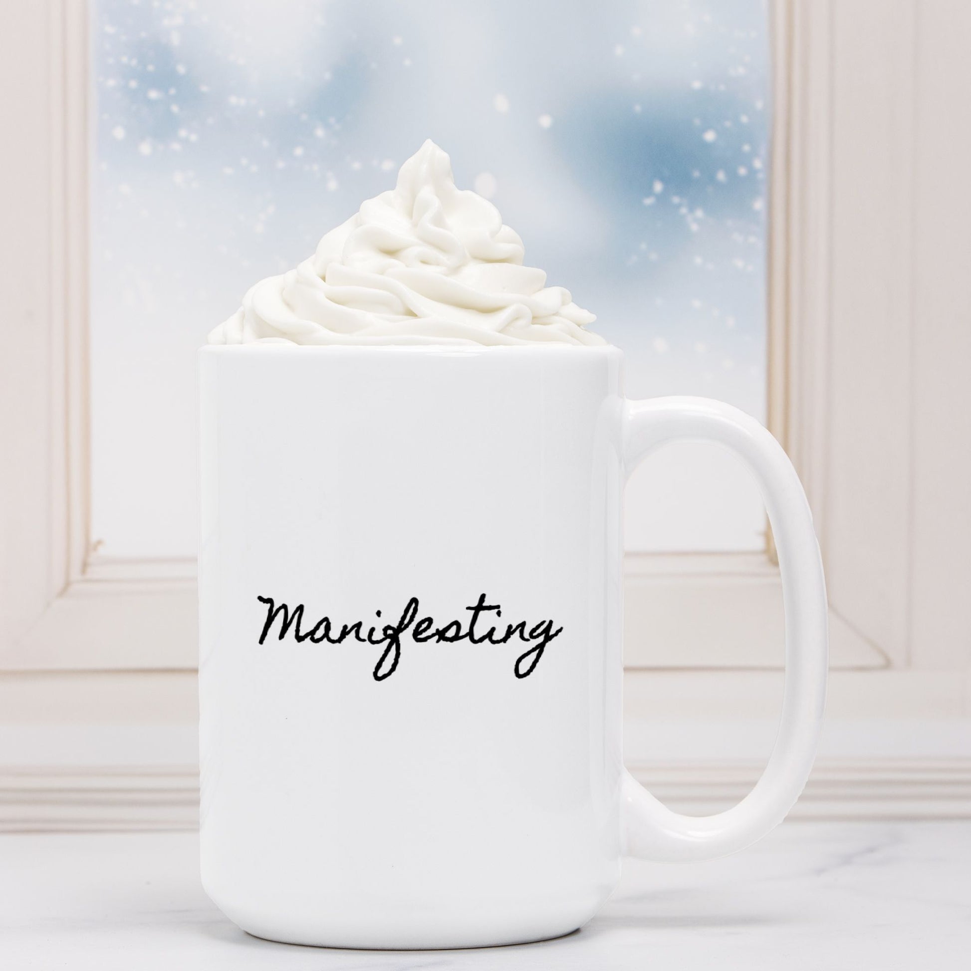 Our deluxe "Manifesting" coffee mug, made from high-quality white ceramic, brings a touch of inspiration to every sip.