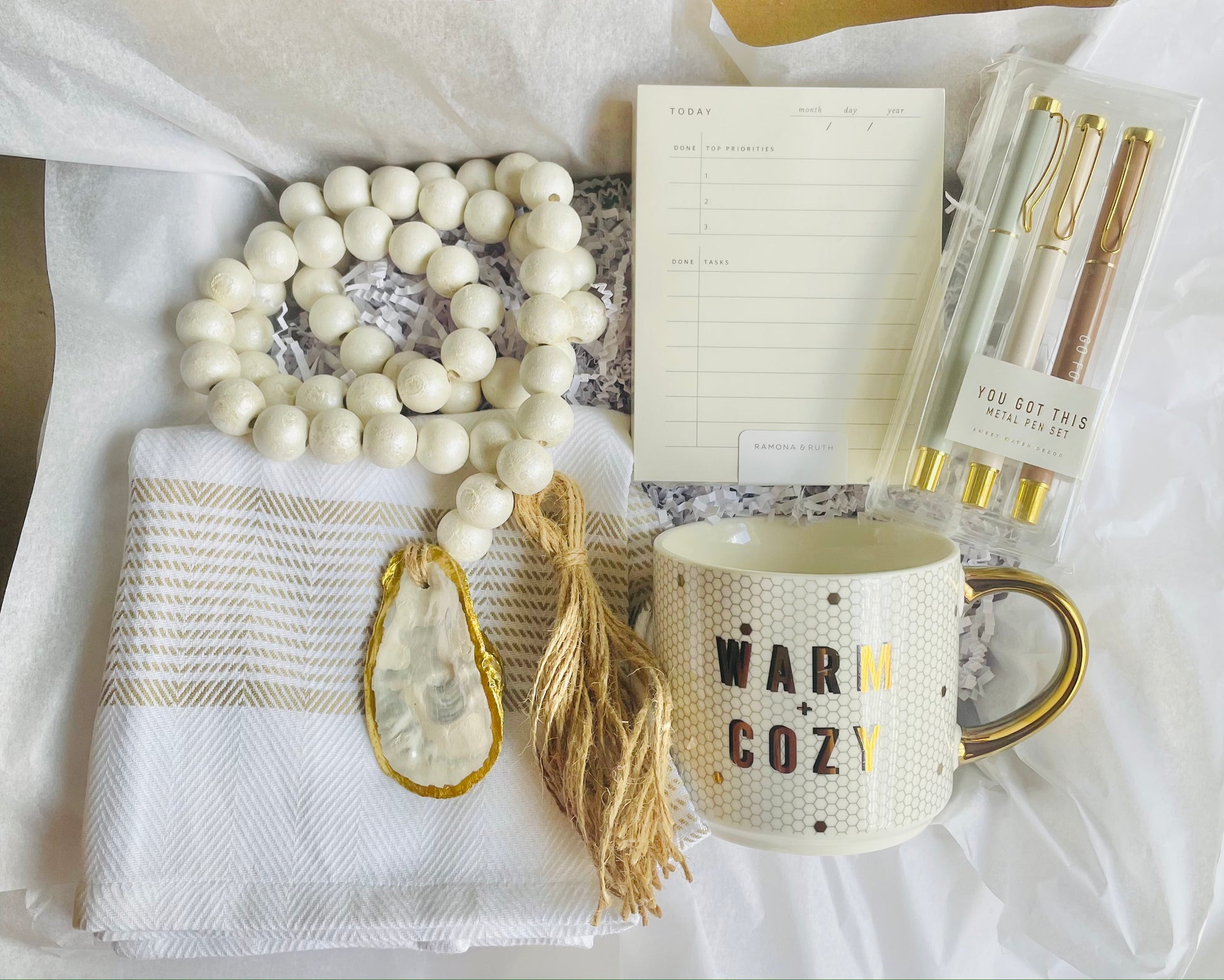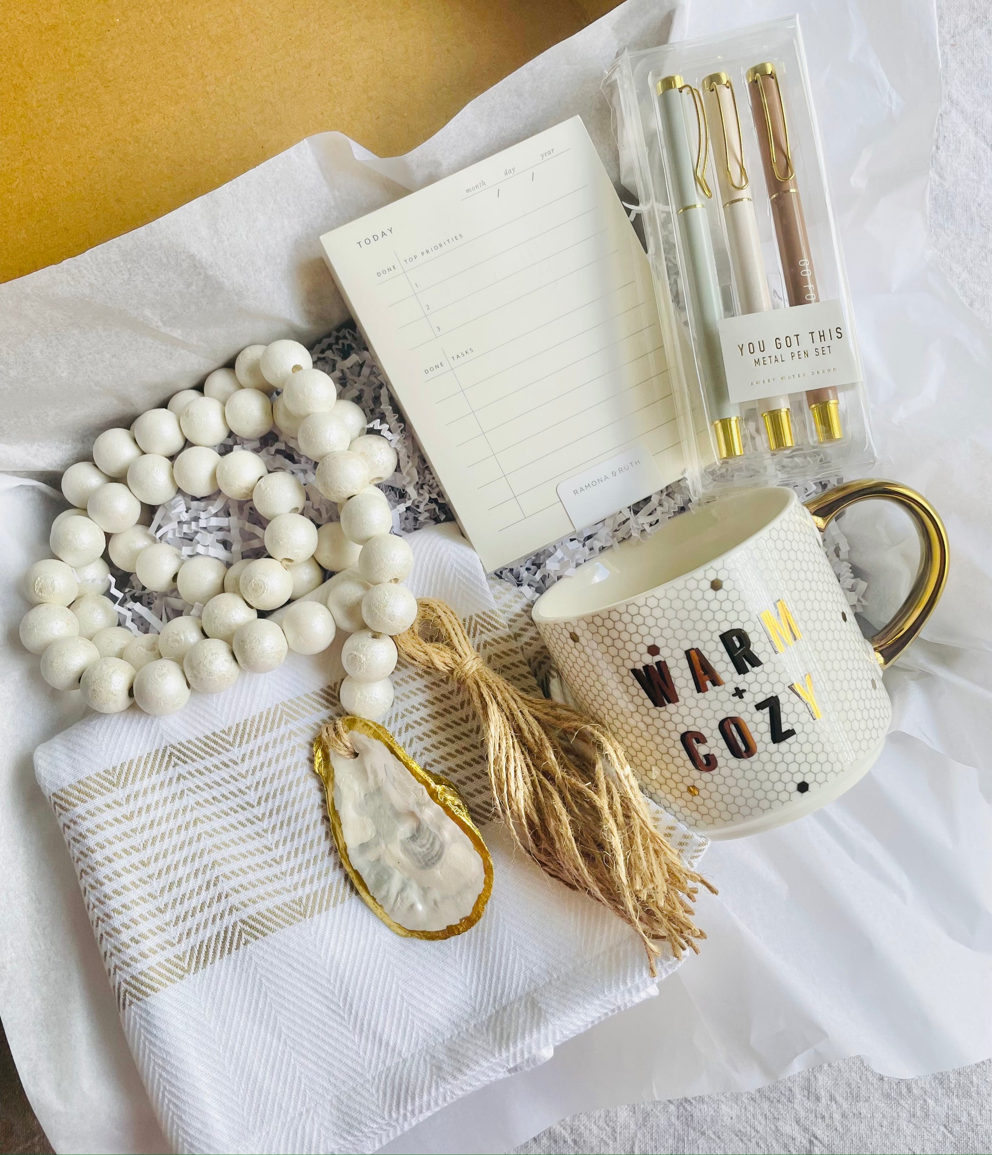 Striped cotton kitchen cloth, Oyster Blessing Beads, Today To Do's Notepad, You Got This Pen Set, Warm + Cozy Coffee Mug.